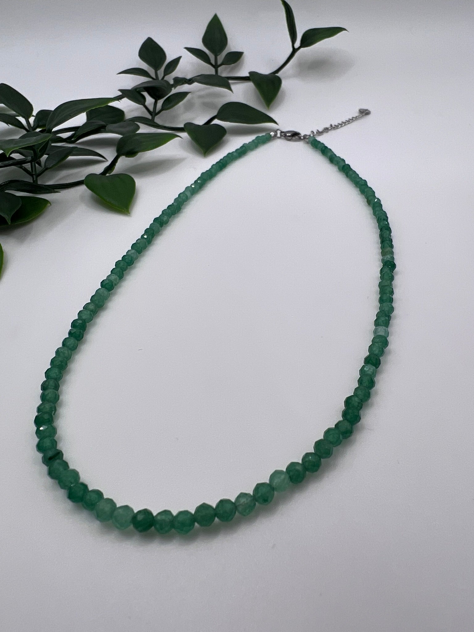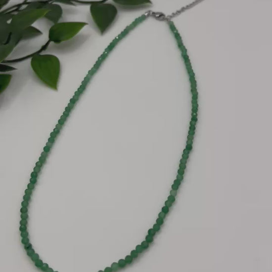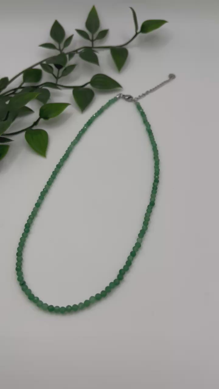 Diese zarte Halskette aus echtem Aventurin verbindet natürliche Schönheit mit spiritueller Tiefe. Die edlen, facettierten Perlen mit einem Durchmesser von 3 mm verleihen der Kette einen sanften Schimmer und lassen sie dezent, aber wirkungsvoll glänzen – ideal für den Alltag oder als eleganter Akzent zu besonderen Anlässen.